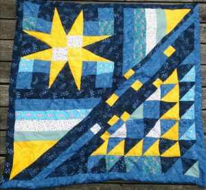 Eine sehr lieb gewonnen Tätigkeit von Jugend auf ist für mich das Handarbeiten. Stricken, Nähen, manchmal auch Häkeln. Einfach weil ich stolz auf meine Kreationen bin, will ich diese den Freunden meines Blogs sichtbar machen. Anleitungen gibt es keine, aber gerne gebe ich auf Anfrage nähere Auskünfte. Sehr selten arbeite ich nach Vorlage, meistes entwerfe ich selbst. Dabei verschlüssle ich gern Zahlensymbole oder geheime Farbsymbolik. Hier eins meiner Meisterwerke, der Geburtsquilt für meinen ersten Enkel Raphael. Er ist teils mit der Maschine, teils von Hand genäht, mit Baumwollfleece gefüttert und von Hand gequiltet. Im Stil folgt er den Arbeiten der amerikanischen Siedlerinnen des 18. und 19. Jahrhunderts.