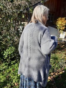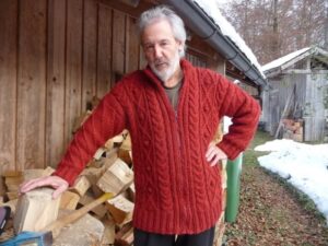 Stricken tu ich im Moment lieber als Nähen, denn es ist gemütlicher. Man sitzt im Sessel, hört vielleicht Musik oder erholt sich einfach in der Ruhe. Am liebsten stricke ich irische Muster, auch diese stelle ich selbst zusammen. Erst kürzlich habe ich mir eine Jacke gefertigt, die wunderbar zu tragen ist. Und für meinen Mann Bernhard habe ich schon 2015 diese rote Jacke gestrickt. Er trägt sie immer noch.