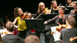 Beim ersten Abokonzert des SOV leitete die Geigerin Lorenza Borrani das Orchester vom Konzertmeisterpult aus. “Play and Conduct heißt das jetzt.